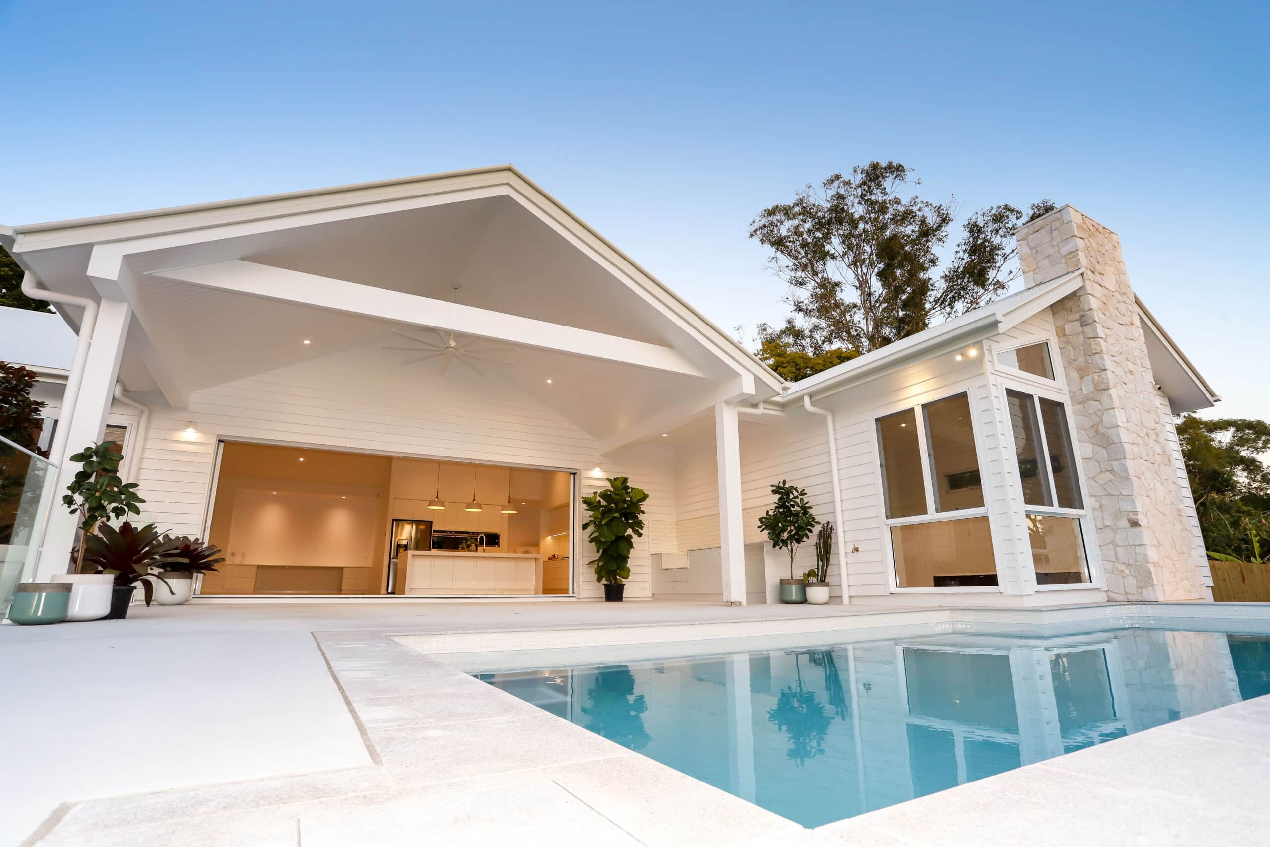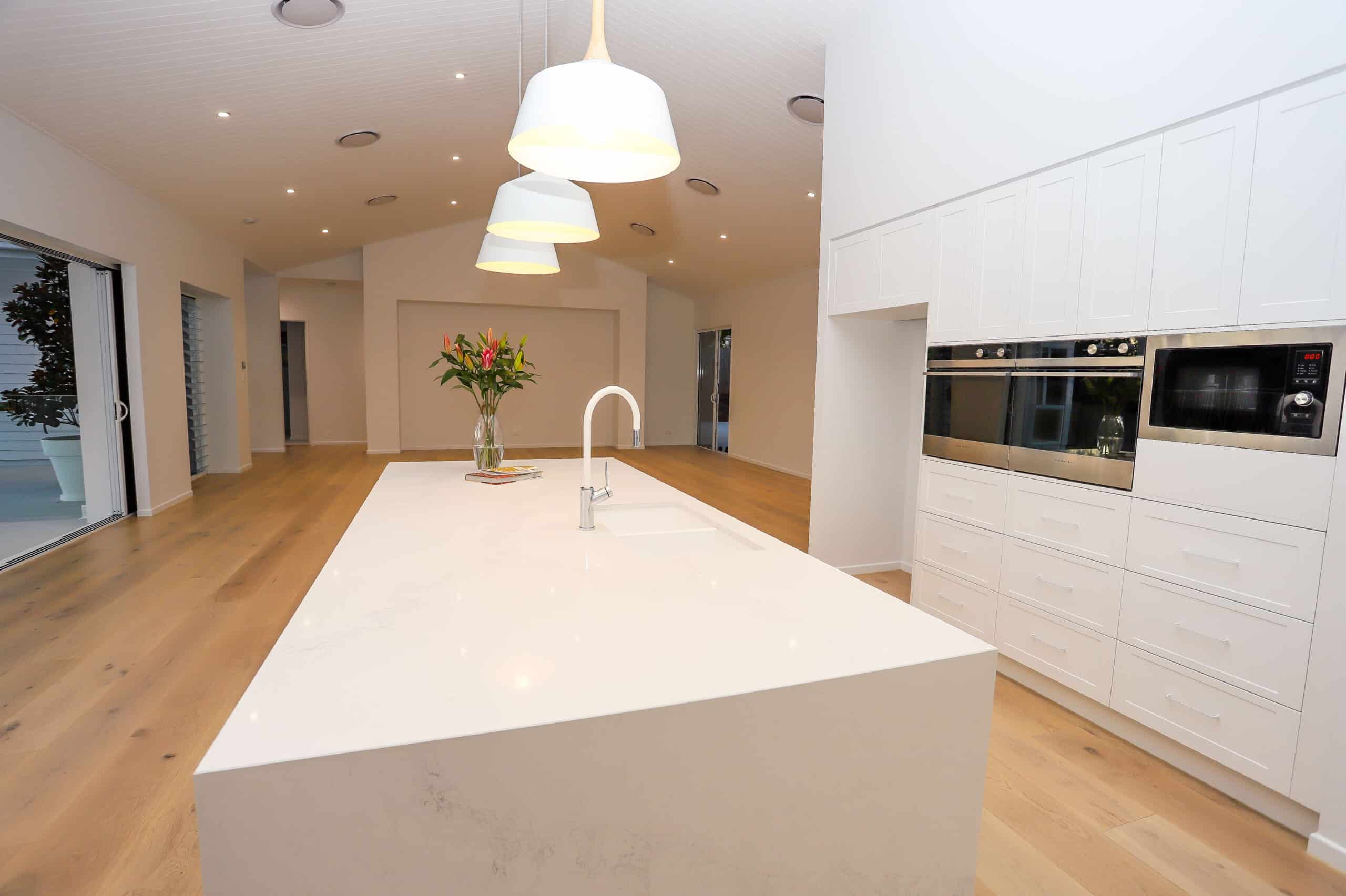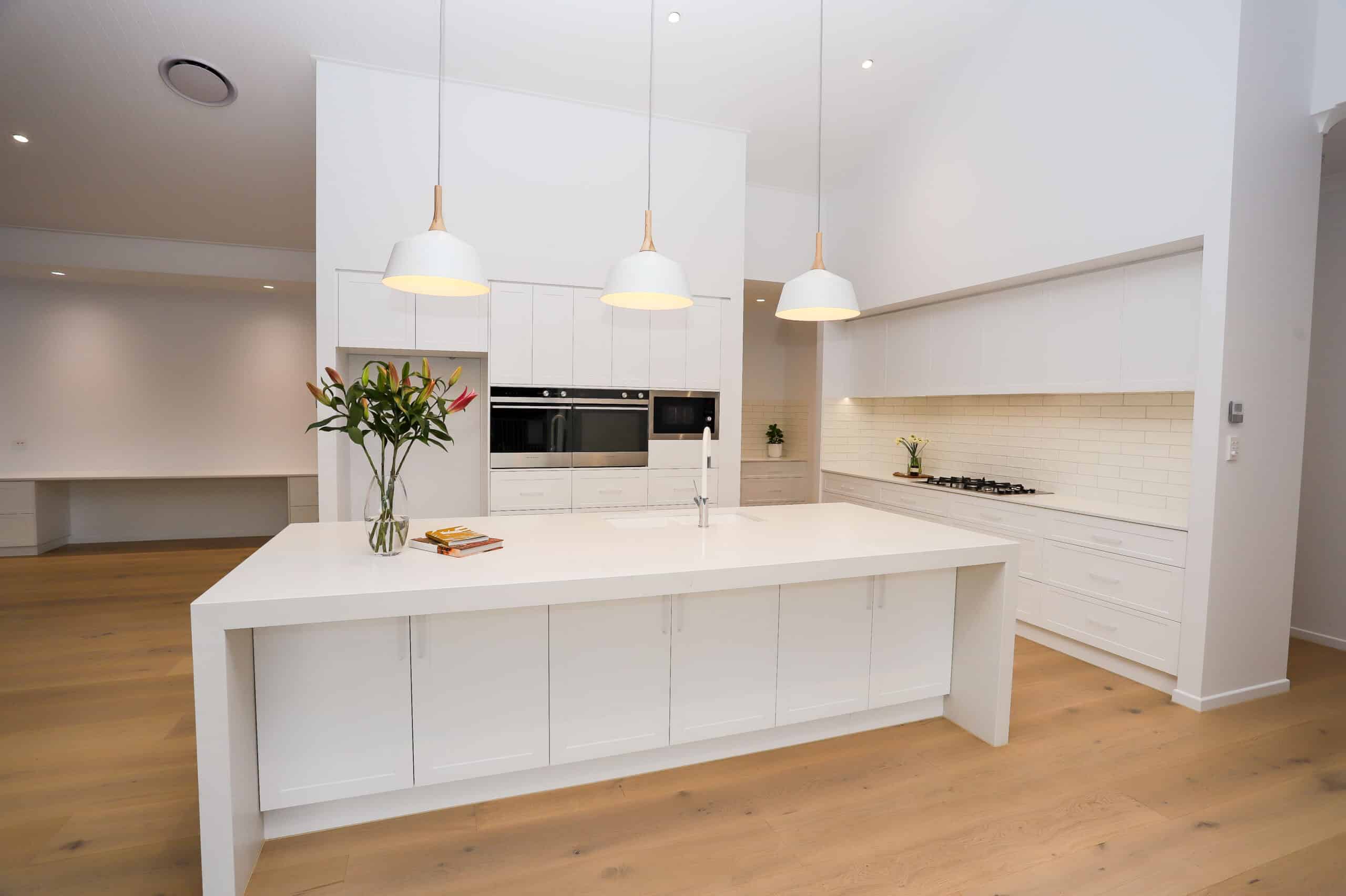 This beautiful home designed By Pride Home Designs ticks all the boxes. It is a large family home in the highly sought-after area of Daisy Hill Brisbane. This impressive 431m2 home has views to Dennis Lake, and the design ensures that the entertaining space takes full advantage of its beautiful views. VJ lined raked ceilings add the element of texture needed to such a large space and the 2 wings either side of the home house the 4 bedrooms, 3 bathrooms & Powder Room. The notable 4 car garage is tucked away out of sight and does not impose on the stunning front facade. Our client selected an all-white colour scheme bursting with different textures and finishes. The oak timber floors inject warmth to the home to ensure a relaxed/classic modern American farmhouse style.