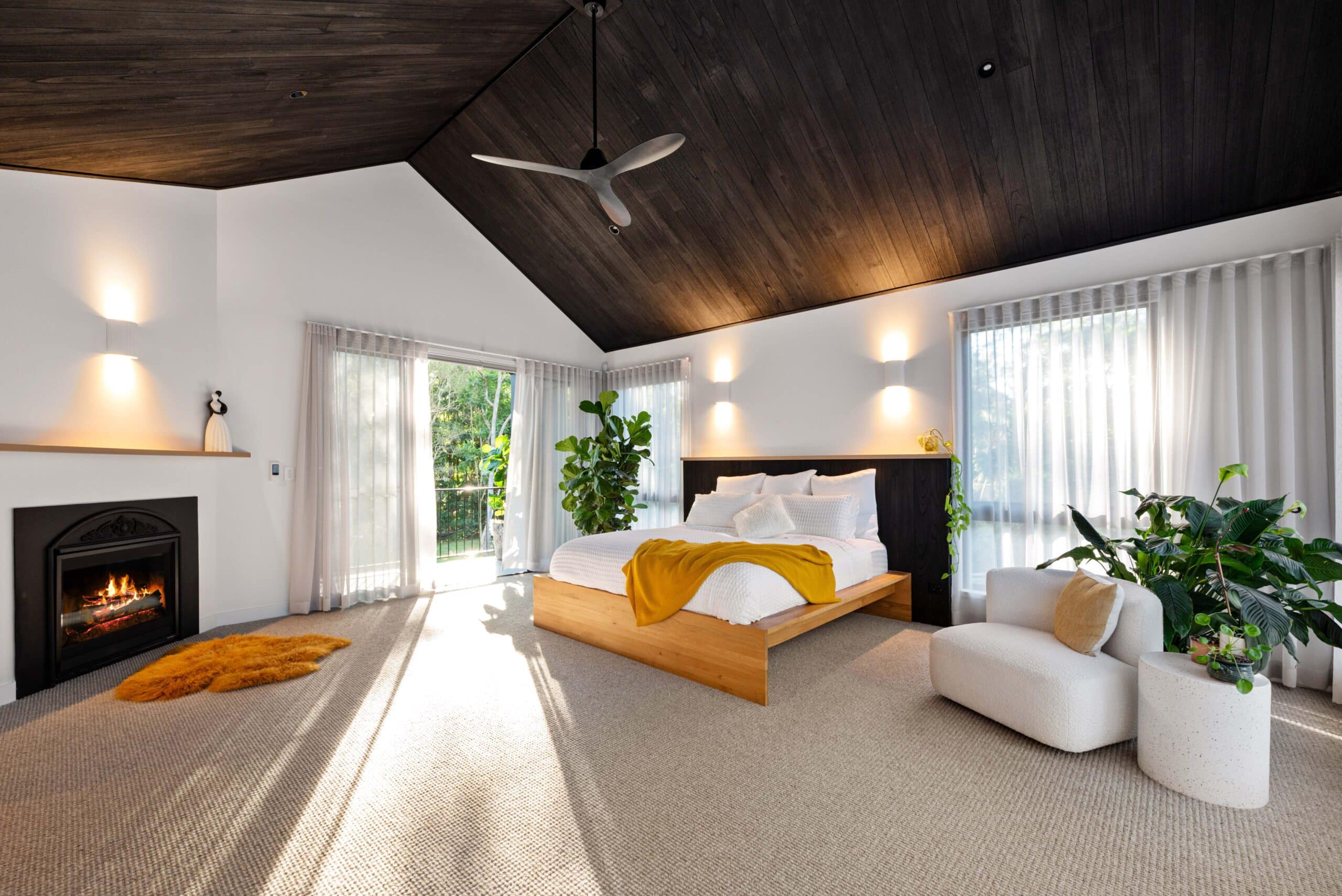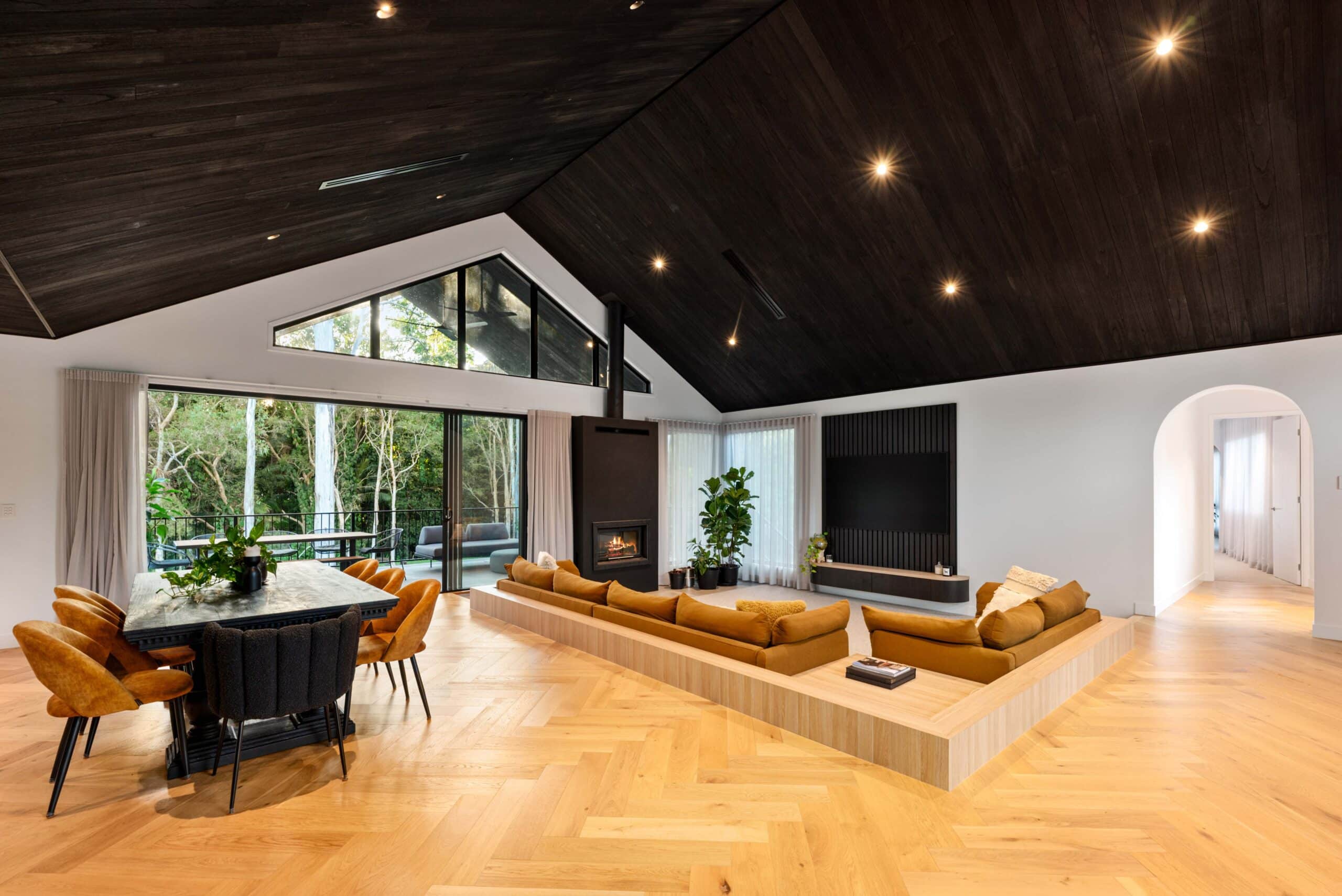 Spanning an impressive 654m2, Obsidian Home is divided into three distinct pavilions – the central living, master wing, and children’s retreat. Each pavilion, with its raked ceilings constructed from steel portal frames and adorned with black prefinished timber boards, exudes a sense of timeless elegance. From the sunken lounge with its indoor-outdoor fireplace to the master wing’s opulent sanctuary boasting a gas fireplace and an open ensuite with luxurious amenities.